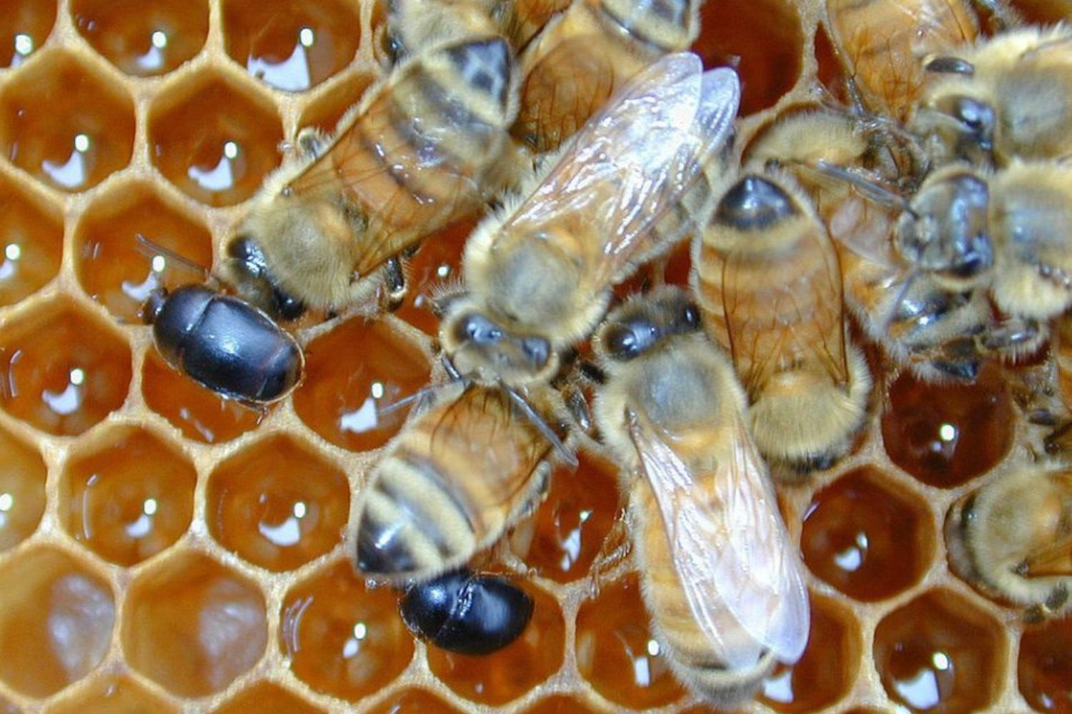 Next, the upper brood chamber (for double brood colonies) as well as supers should be inspected. Boxes should be moved out of the way, left for a few minutes and then checked again to see if any beetles are present.