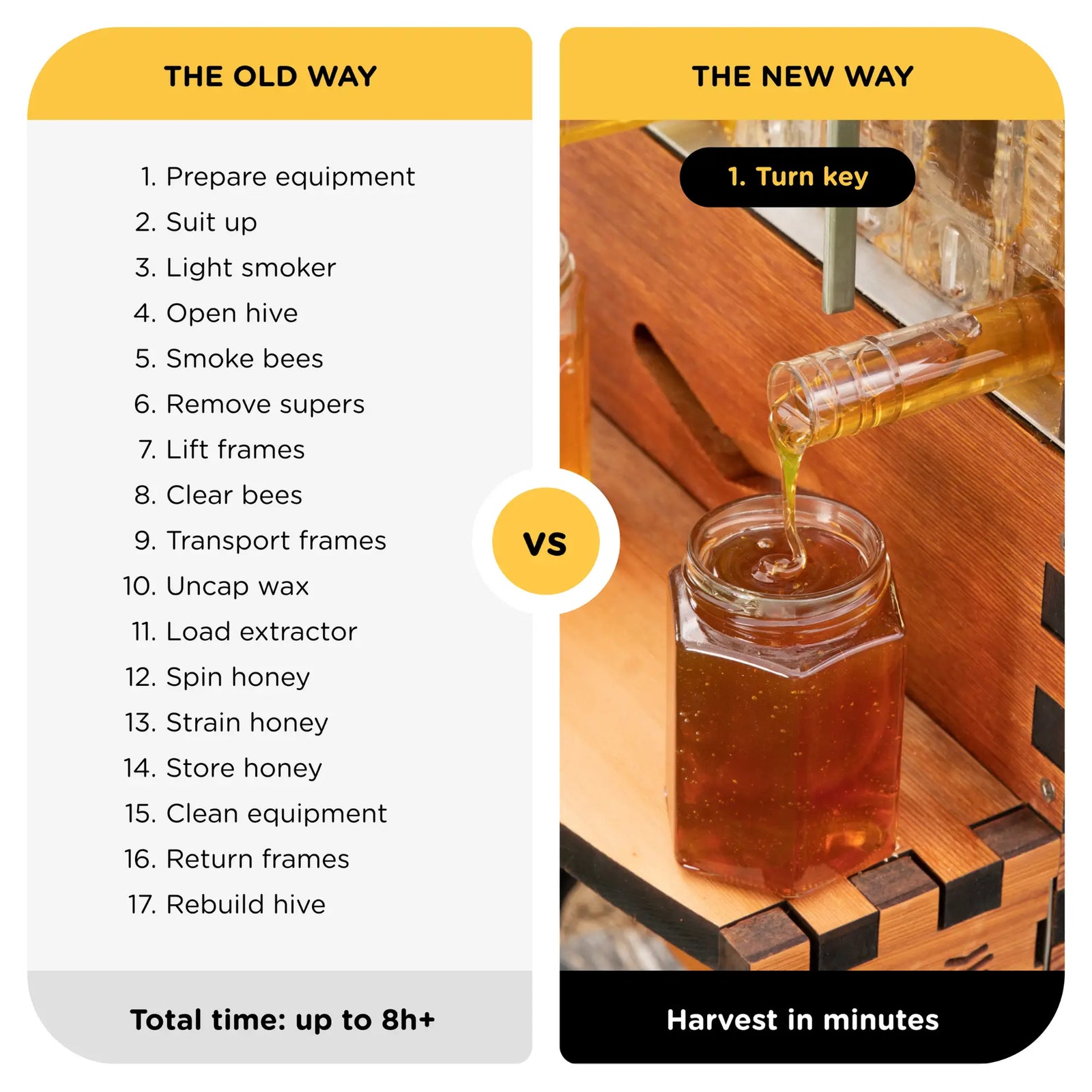 Conventional honey harvesting takes hours and requires specialist equipment and a dedicated space. Not to mention the cleanup afterwards!